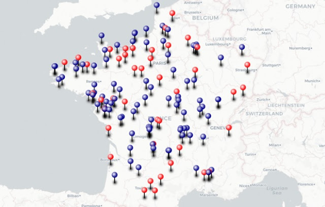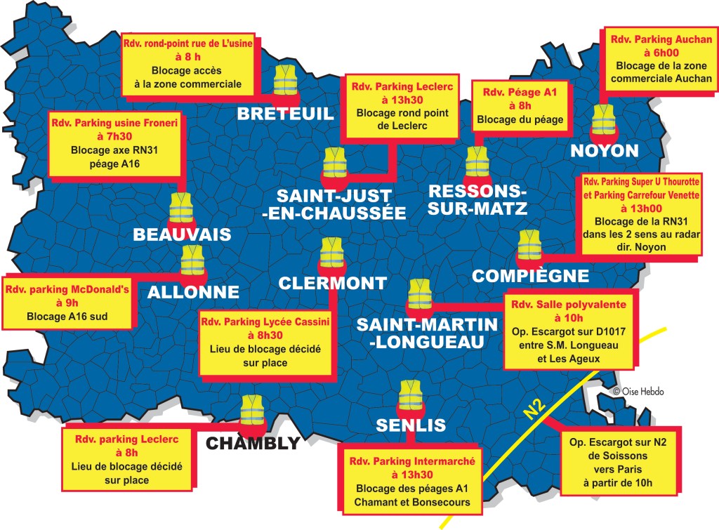 Il convient en revanche de nuancer pour les petites villes où les points de rassemblement sont beaucoup plus diversifiés. Ce sont aussi bien des places de marché, des parkings de supermarchés, de salles polyvalentes, de mairies ou d'établissements scolaires... Voici par exemple une carte des points de rendez-vous dans le département de l'Oise publiée par Oise Hebdo.