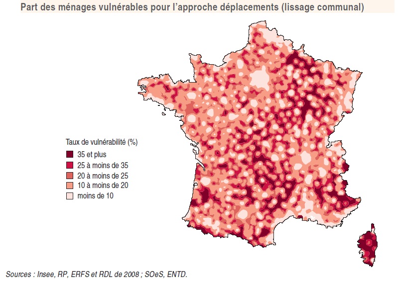 La dimension socio-territoriale ne peut pour autant être évacuée. Une étude publiée par INSEE Première en 2015 montre de fortes inégalités territoriales en termes de vulnérabilité énergétique. Les cartes dressées par l’INSEE soulignent que le risque de grande vulnérabilité (probabilité de subir des dépenses supérieures au double de la médiane nationale à la fois au titre du chauffage domestique et au titre des transports quotidiens) est d’autant plus élevé que l’on demeure loin des pôles urbains, pour atteindre le maximum de 9, 5% en zone rurale hors de toute aire urbaine soit 3 ,5 fois plus que la moyenne nationale. Cette étude de l'INSEE a pour intérêt d'envisager simultanément (tout en les dissociant) la vulnérabilité liée aux déplacements et la vulnérabilité liée au logement, cette dernière étant presque plus importante même si elle ressort moins dans les revendications des manifestants.