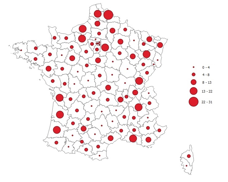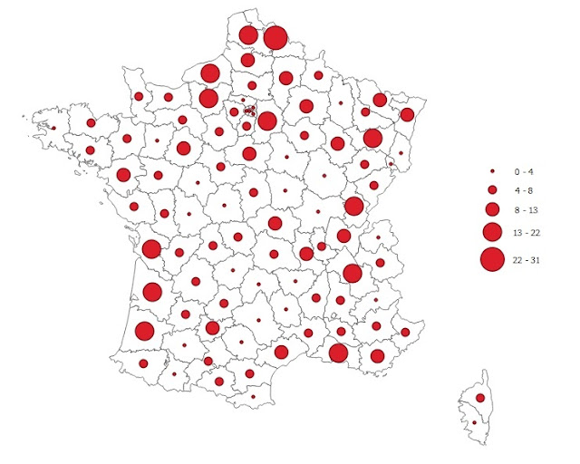 Nous avons repris la base de données des 713 points de blocage (fichier kml téléchargé à partir de Google Maps) pour pouvoir faire quelques analyses dans QGIS. Voici la carte du nombre de blocages prévus par département sous forme de figurés ponctuels avec classification par seuils naturels (algorithme de Jenks) :