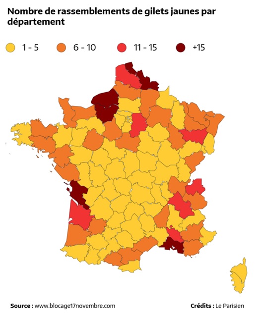Au premier abord les lieux de rassemblement se trouvent éparpillés sur l'ensemble du territoire. Mais certains départements sont plus représentés que d'autres. Le journal Le Parisien a recensé le nombre de points par départements au 6 novembre 2018 dans une carte à la sémiologie elle aussi pour le moins approximative : le chiffre absolu est représenté en aplat de couleurs sans tenir compte de la surface du département ni de l'importance de sa population (un mapfail caractérisé et répété dans cette autre carte du nombre de personnes mobilisées sur Facebook).