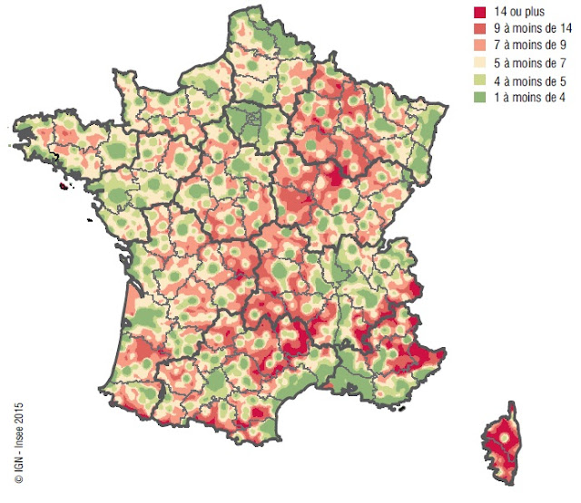 Il peut être intéressant de confronter cette analyse avec la carte des temps d'accès routiers de l'INSEE qui montre que l'accessibilité aux principaux services de la vie courante est effectivement très inégale. Les temps d’accès vont du simple au triple, le temps moyen (4 minutes) restant peu élevé malgré tout. Il s'agit cependant d'une moyenne qui ne tient pas compte des contraintes par exemple en zones de montagne ou dans des zones moins bien desservies par les voies de communication. Les personnes résidant dans un pôle urbain accèdent le plus rapidement aux services. C’est moins le cas dans les couronnes périurbaines de ces pôles, mais c’est au-delà de la limite périurbaine que les temps d’accès sont les plus longs. Pour autant la fable densité des campagnes ne rime pas toujours avec la faible accessibilité comme le montre cette étude de l'INSEE réalisée en 2016 sur le Languedoc-Roussillon.