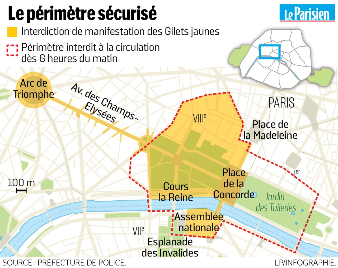 Les zones interdites de manifestation à Paris (Le Parisien, 22 mars 2019). Lire l'article.