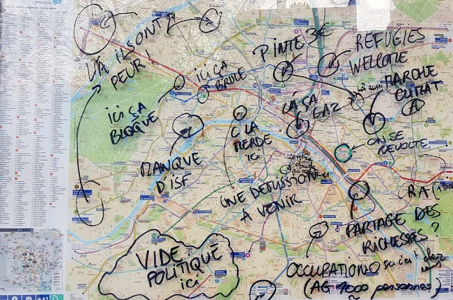 Agnès Stienne, qui avait conçu en 2012 pour Le Monde Diplomatique une carte sur les lieux de pouvoir à Paris sous le titre Il était une fois dans l'Ouest, a repris et actualisé cette carte. Celle-ci indique les nouveaux lieux de manifestations et de rassemblements des Gilets jaunes les 24 novembre et 1er décembre 2018 à Paris. Ces lieux sont complètement différents des parcours traditionnels de manifestation (Bastille - Nation - République) et concernent désormais les quartiers riches et les lieux symboliques du pouvoir. En s'élargissant, le mouvement des Gilets jaunes serait-il en train de conquérir les lieux de centralité et de menacer le pouvoir politique ? Lire l'article.