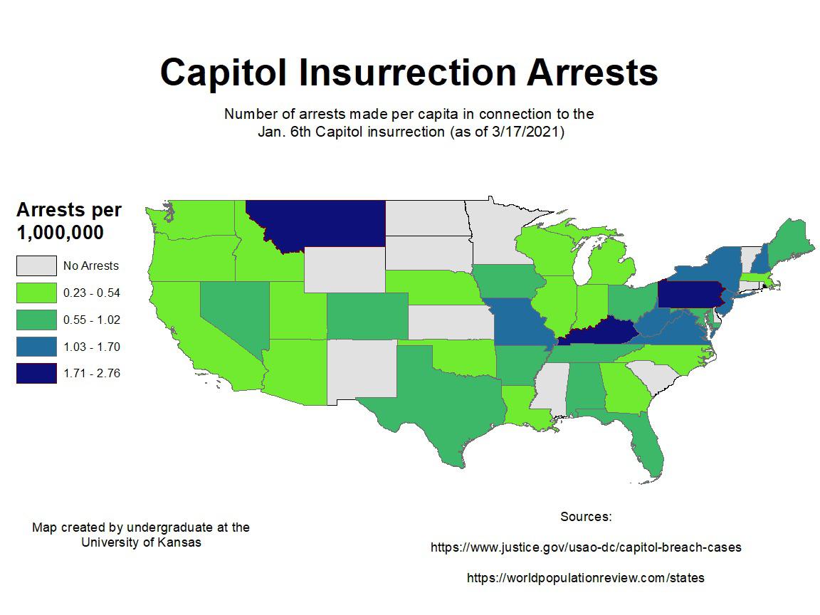 Nombre d'arrestations au 17 mars liées à l'attaque du Capitole, rapporté à la population de chaque état des États-Unis (source : United States Department of Justice) :