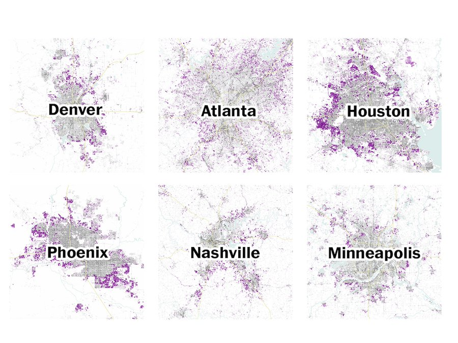 L'urban sprawl est plus marqué au Texas, en Floride et en Californie, mais concerne aussi les villes de taille moyenne du Midwest.