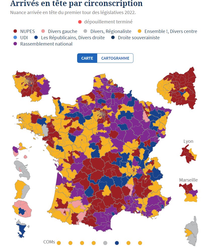 Ce billet fait suite à celui consacré aux élections présidentielles d'avril 2022. L'objectif poursuivi est le même : fournir une approche critique des cartes que l'on peut trouver dans les médias et en même temps permettre de s'initier à la cartographie électorale. Il s'agit de donner accès aux données et à la fabrique de l'information, mais aussi de comparer les choix cartographiques opérés par les médias (limités ici à la presse française). Nous complétons ce billet par une mise en perspective historique en abordant les cartes de résultats électoraux telles qu'elles ont commencé à apparaître et se diffuser au XIXe siècle : l'occasion de mesurer les évolutions de la cartographie électorale sur un temps long et de voir une certaine permanence des questions qui lui sont posées.