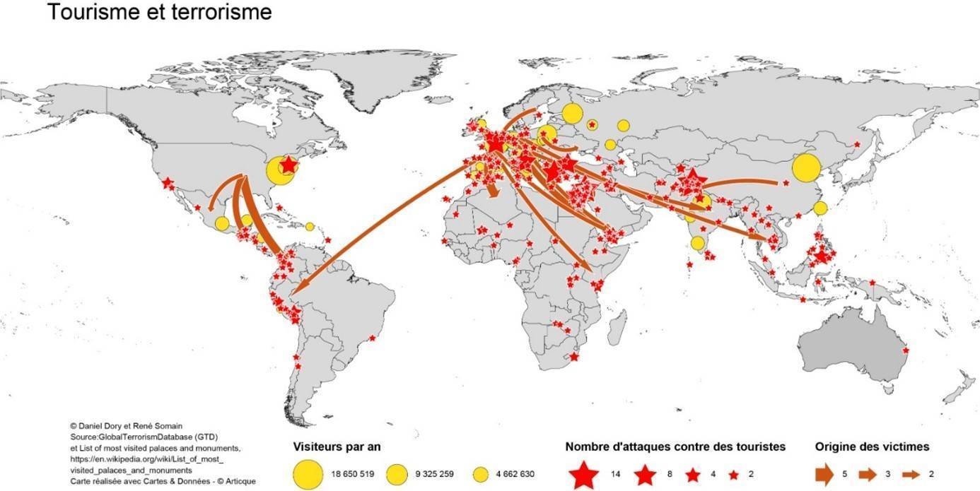 Les mêmes auteurs ont travaillé sur les relations entre terrorisme et tourisme dans le but « d’explorer cette thématique complexe à l’aide d’une démarche cartographique novatrice, permettant d’avancer vers une meilleure formulation des hypothèses de travail à partir de données empiriques contrôlables » :