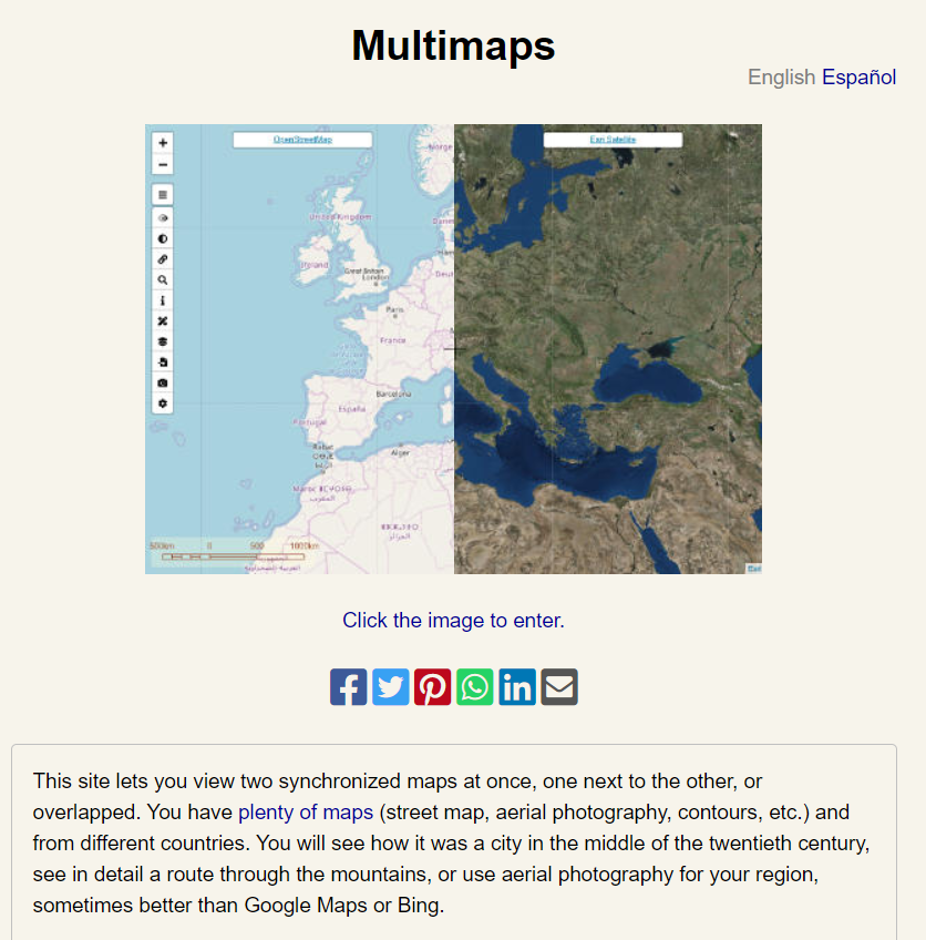 L'application en ligne Multimaps permet de comparer des cartes topographiques, des images aériennes, des cartes anciennes, etc. Ce double visualisateur en ligne a été développé par Javier Jiménez Shaw.