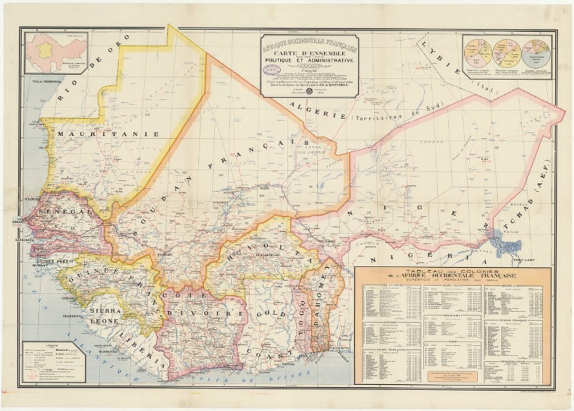 https://gallica.bnf.fr/ark:/12148/btv1b530652658.r=edouard%20de%20martonne?rk=21459;2Petit atlas administratif, ethnographique et économique de l'Afrique occidentale française par Édouard de Martonne, 1928.