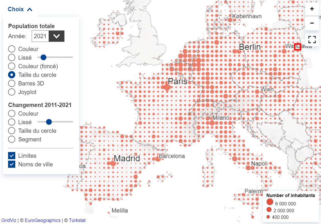 Eurostat, le site de statistiques officielles de l'Union européenne, a mis en ligne en mars 2023 une application cartographique qui permet de représententer les données de population par mailles de recensement d'1 km². Il s'agit des données harmonisées 2021, disponibles pour l'Union européenne et pour trois pays de l'AELE.