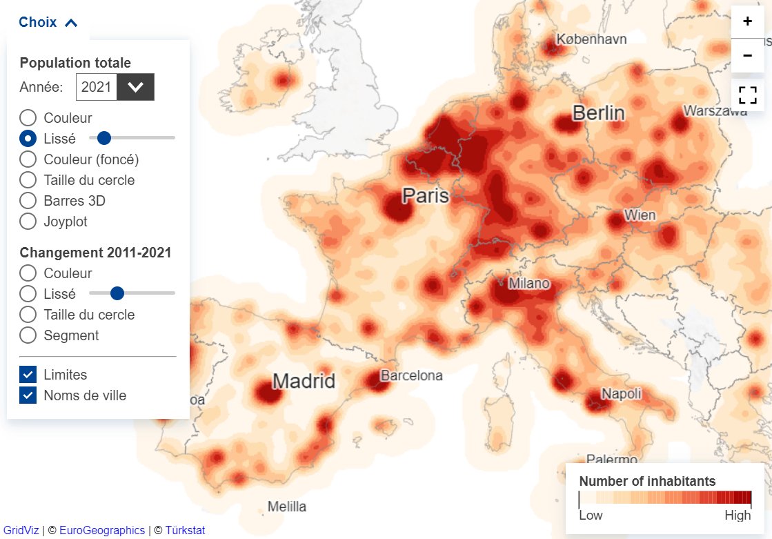Eurostat, le site de statistiques officielles de l'Union européenne, a mis en ligne en mars 2023 une application cartographique qui permet de représententer les données de population par mailles de recensement d'1 km². Il s'agit des données harmonisées 2021, disponibles pour l'Union européenne et pour trois pays de l'AELE.