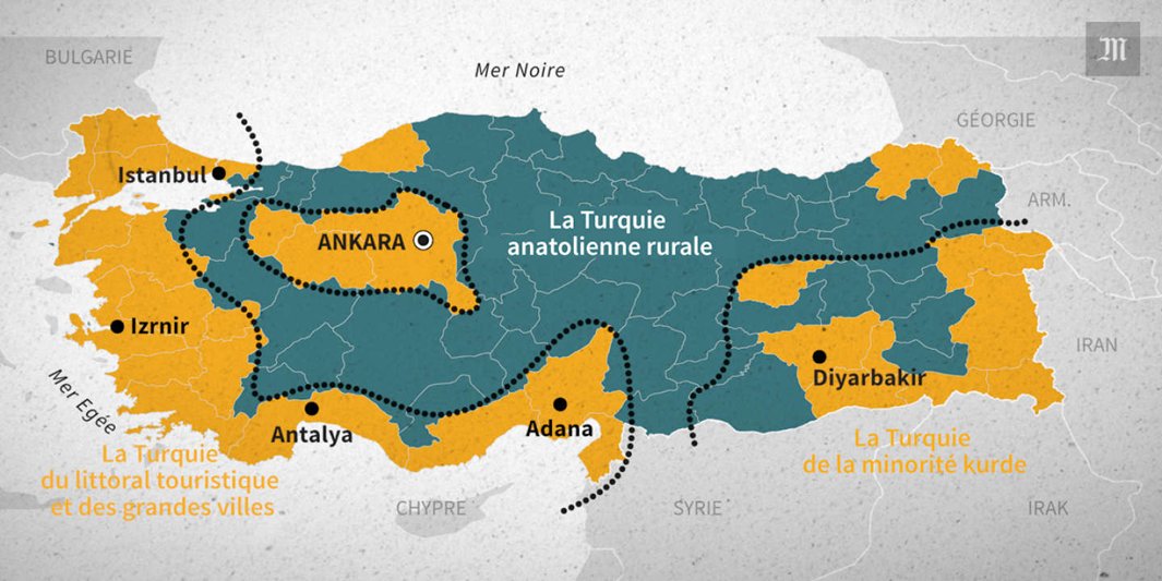 - la Turquie du littoral touristique et des villes à l'ouest et au sud ainsi que la minorité kurde à l'est