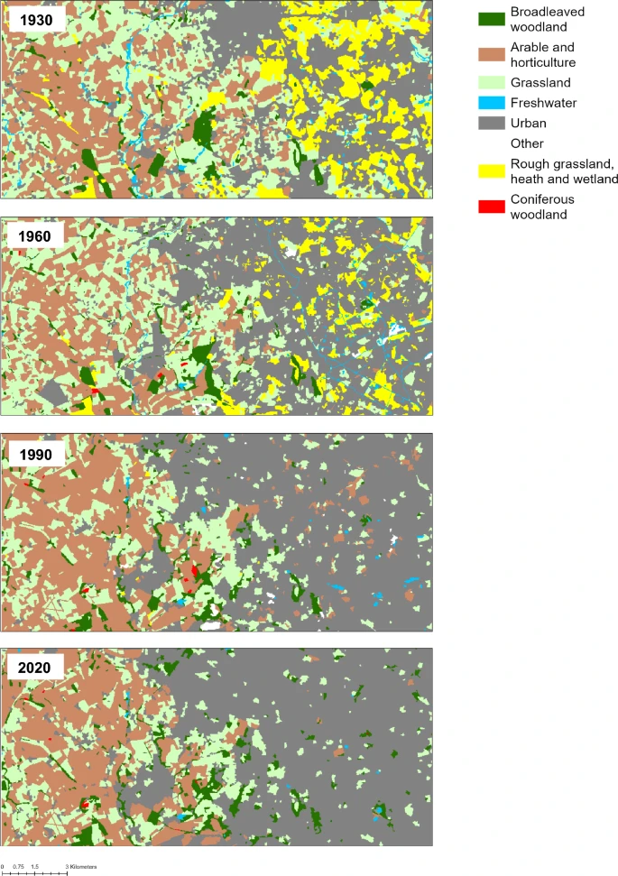 Le Royaume-Uni a connu une intensification spectaculaire de l'utilisation des terres au cours du XXe siècle, entraînant une perte importante d'habitats semi-naturels, comme ailleurs en Europe. Une nouvelle analyse de cartes d'occupation des sols des années 1960 apporte un éclairage inédit sur le rythme et l'ampleur des pertes d'habitats causées par l'intensification agricole et la croissance urbaine d'après-guerre en Angleterre et au Pays de Galles. Une équipe dirigée par Lucy Ridding, spécialisée en modélisation et analyse spatiale (Centre britannique d'écologie et d'hydrologie), a comparé un échantillon de 15 % des cartes des années 1960 avec les données d'occupation des sols des années 1930, 1990 et 2020. Après avoir produit les cartes finales d'occupation du sol à une résolution de 25 m pour chacune des quatre périodes, nLa perte et la dégradation des habitats causées par les changements d’affectation des sols par l’homme constituent l’un des principaux facteurs du déclin de la biodiversité.