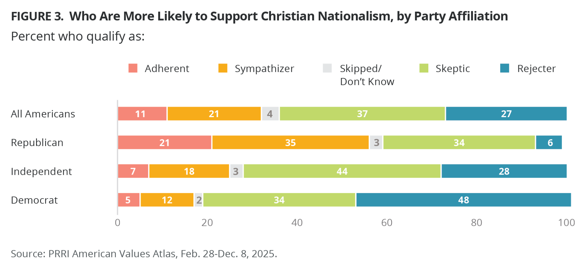 Pour mesurer le nationalisme chrétien, le Public Religion Research Institute a utilisé un questionnaire portant sur les liens entre le christianisme, l'identité américaine et le gouvernement des États-Unis. D'après des entretiens menés auprès de plus de 22 000 adultes tout au long de l'année 2025, environ 11 % des personnes interrogées se sont déclarées nationalistes chrétiens, 21 % sympathisants, 37 % sceptiques et 27 % réfractaires. La proportion d'Américains se déclarant partisans ou sympathisants du nationalisme chrétien est restée stable depuis fin 2022. Une majorité des Républicains se qualifient d'adeptes du nationalisme chrétien (21 %) ou sympathisants (35 %), contre un quart des indépendants (7 % d'adeptes et 18 % de sympathisants) pour moins de 2 Démocrates sur 10 (5 % d'adeptes et 12 % de sympathisants). L'enquête 2025 du PRRI sur les valeurs américaines s'est intéressée aussi aux sources d'information auxquelles les Américains font le plus confiance pour obtenir des informations fiables sur la politique et l'actualité. Près des deux tiers des Américains qui font le plus confiance aux médias d'extrême droite se déclarent nationalistes chrétiens (34 %) ou sympathisants (31 %), tout comme une majorité de ceux qui font le plus confiance à Fox News (18 % des nationalistes et 37 % des sympathisants) et environ la moitié de ceux qui font le plus confiance aux sources d'information radio.