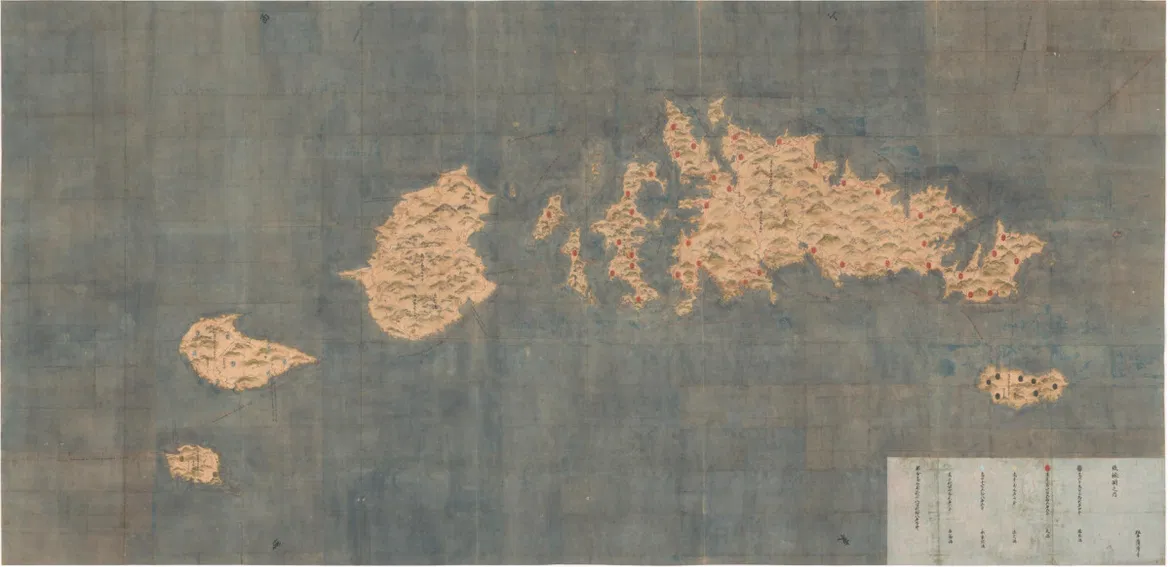 Le Ryukyu Kuniezu se compose de trois grandes cartes dessinées à la main représentant le royaume de Ryukyu et ses archipels. Datant du XVIIe siècle, chaque carte mesure plusieurs mètres de large, ce qui les rend difficiles à exposer ou à étudier physiquement. Ces cartes présentent les îles Ryukyu comme un monde maritime unifié. De longs chapelets d'îles s'étendent entre le sud du Japon et Taïwan, avec Okinawa en son centre. La précision du rendu des côtes et l'espacement entre les îles permettent de saisir clairement comment la géographie a façonné la vie politique et économique. Sans même lire chaque légende, on perçoit la mise en valeur de certaines zones, l'aménagement des littoraux et la manière dont le royaume envisageait son territoire.