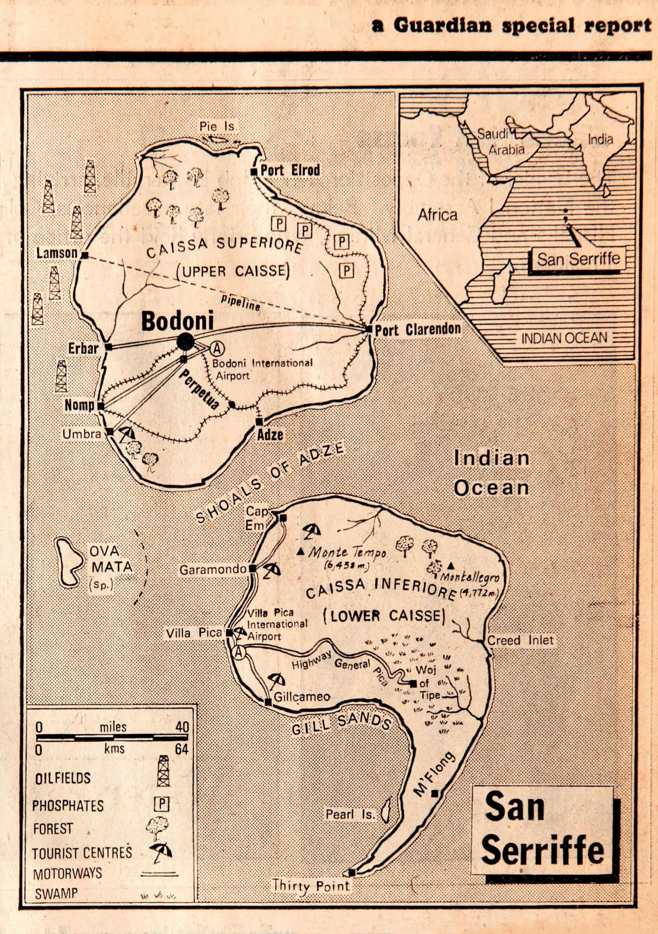 Carte de San Serriffe, extraite du reportage spécial du Guardian de 1977 (crédit : © The Guardian)